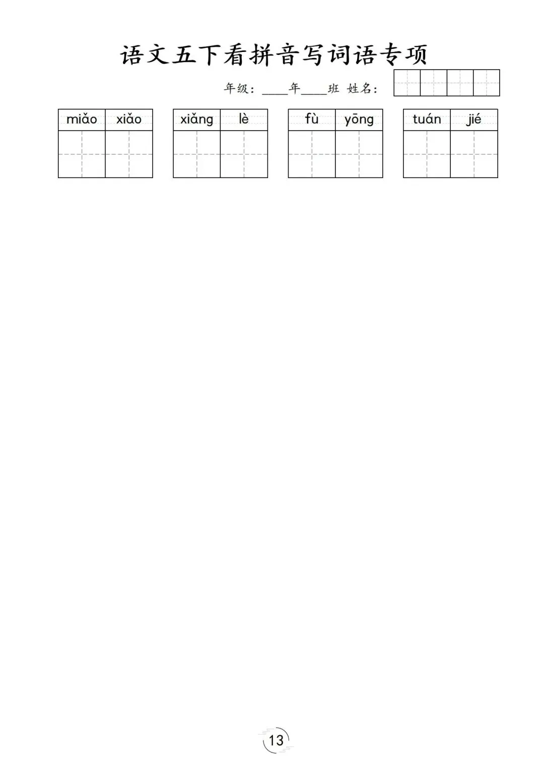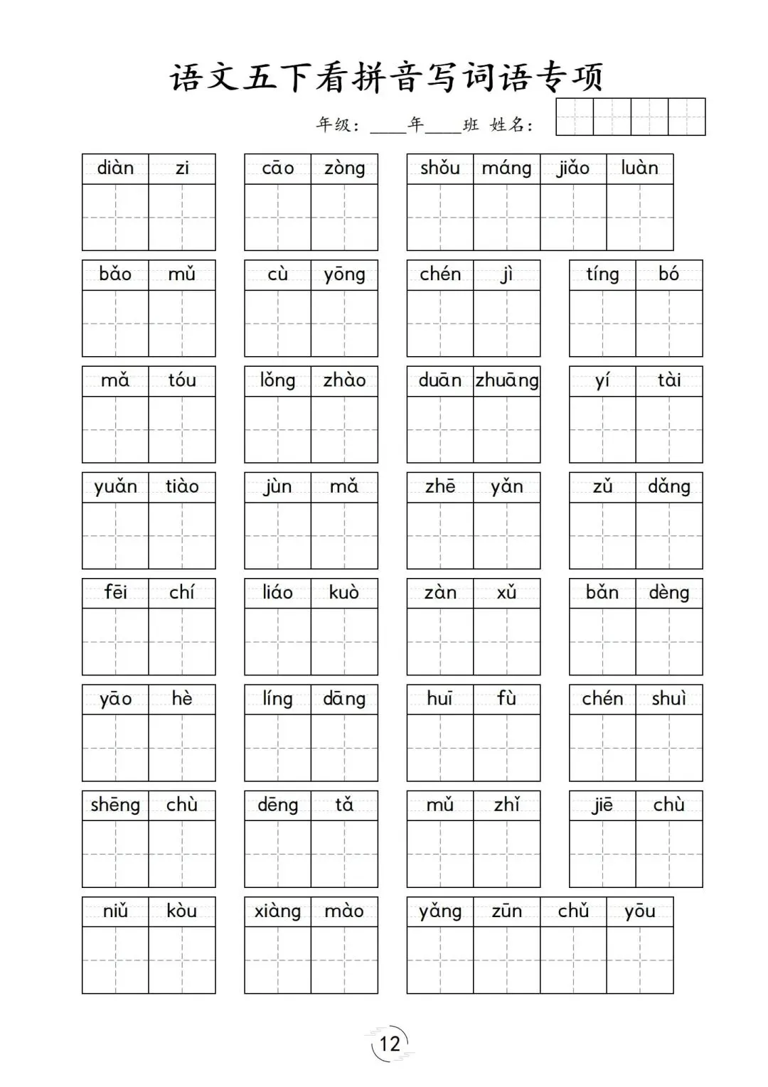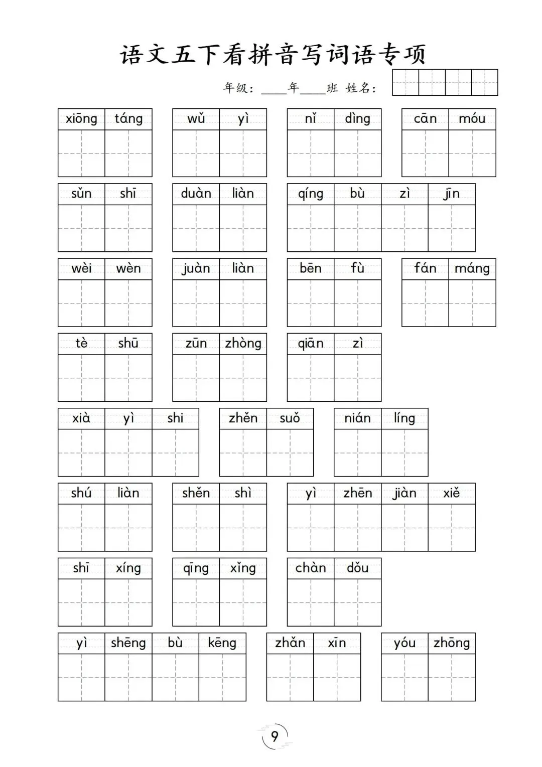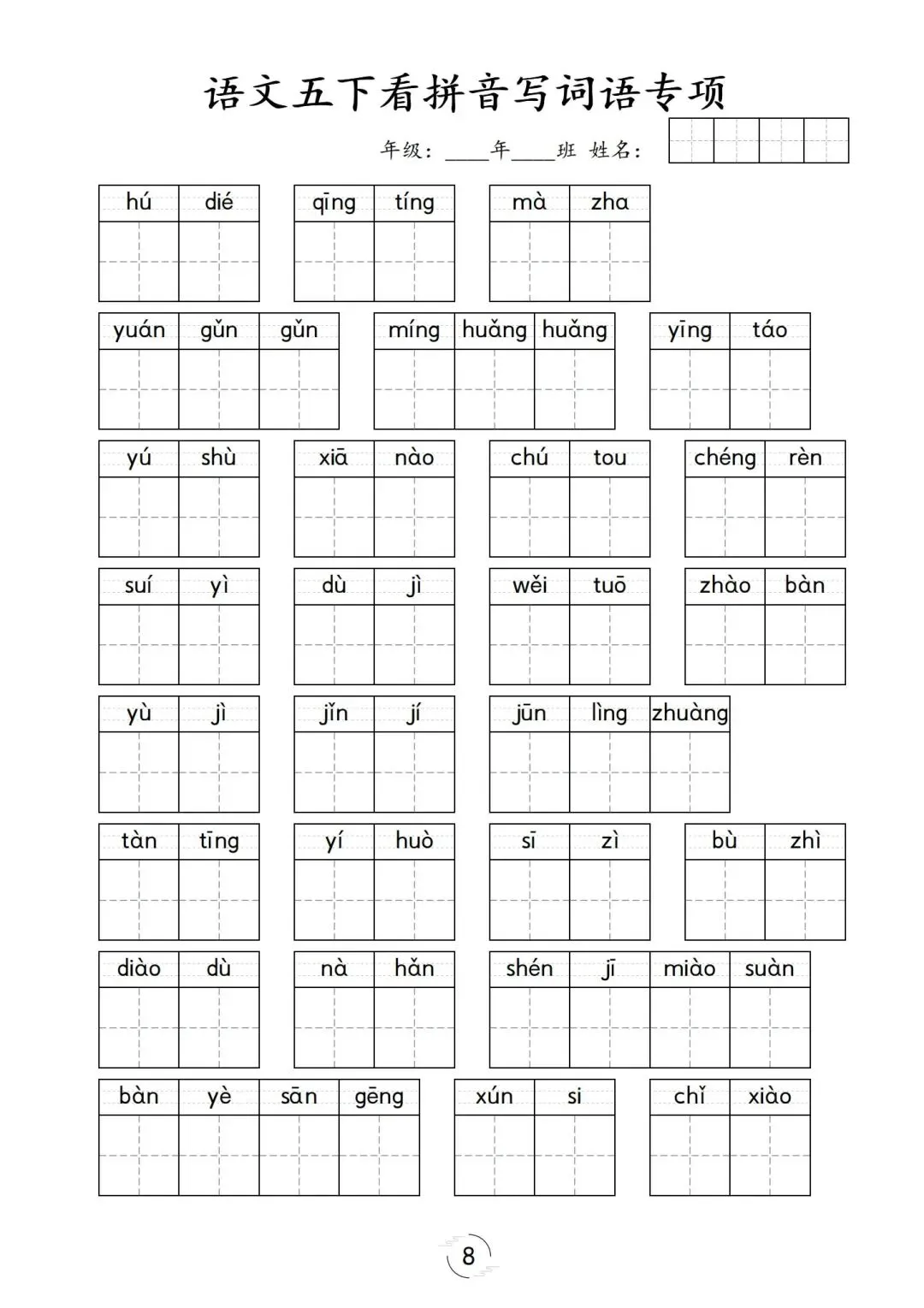 五年级下册第1-8单元看拼音写词语,可下载