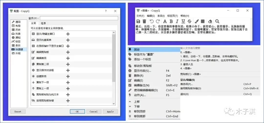 CopyQ 是一个免费开源的电脑剪切板增强软件;软件支持 Windows 、支持 Mac 、也支持 Linux 。