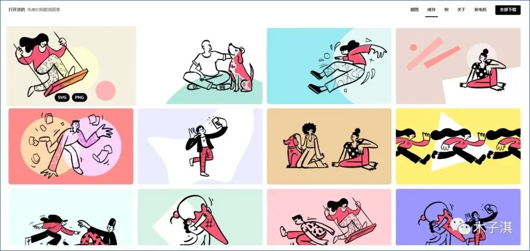 点击网站的第二个功能版块,可以看到这里提供了更多色彩和样式的插画素材,也支持 SVG 和 PNG 格式下载。