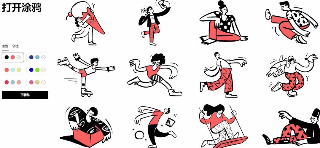 它支持一键切换插画主题,修改插画配色,并且你还可以点击网站右上角的全部下载,一键下载完整的插画包。