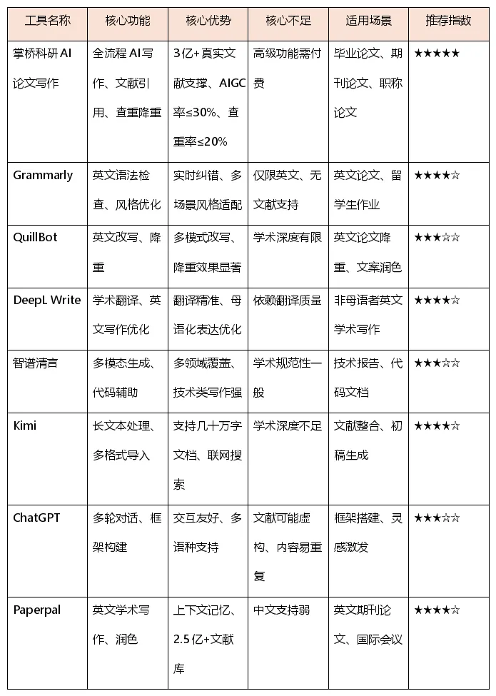 根据不同的学习阶段和论文需求,推荐以下选择路径: – 毕业论文/学位论文:优先考虑掌桥科研AI论文写作,其全流程覆盖和文献支撑能力能帮你系统性地完成大论文。 – 英文论文/国际发表:Grammarly+Paperpal组合使用,一个负责语言优化,一个负责学术规范性。 – 职称论文/课程论文:根据时间紧迫程度,掌桥科研AI论文写作适合高效完成,Kimi适合整合现有资料。 – 技术类论文/实验报告:智谱清言在代码和技术写作方面优势明显,是不错的选择。