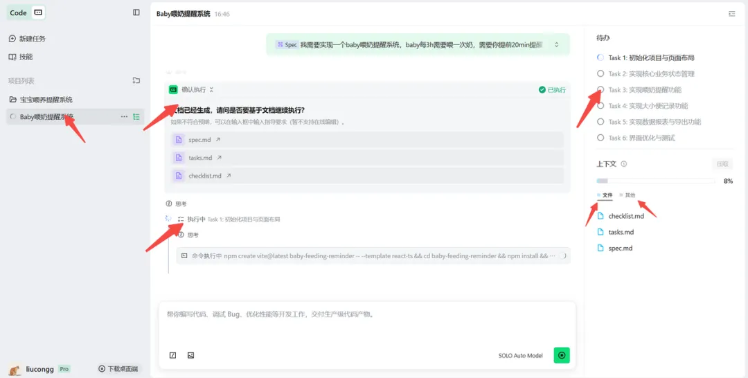 Code 模式这边就更专业了,执行过程、代办清单、文件管理、上下文关联全都展示得清清楚楚,每一步在干嘛、做到哪一步,你都能实时盯着看,方便随时调整和干预。