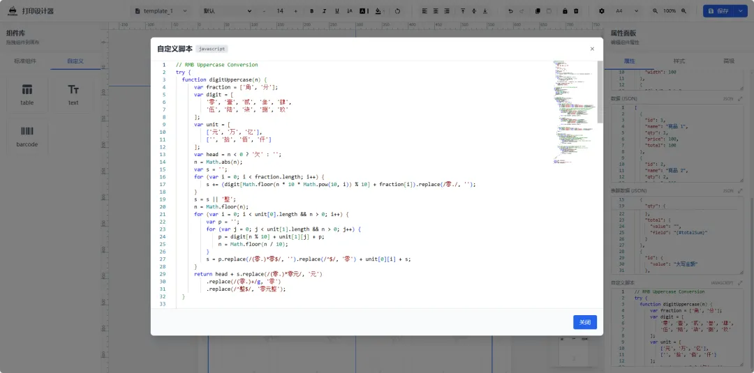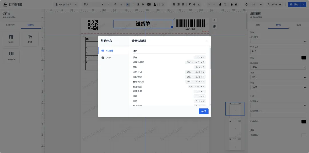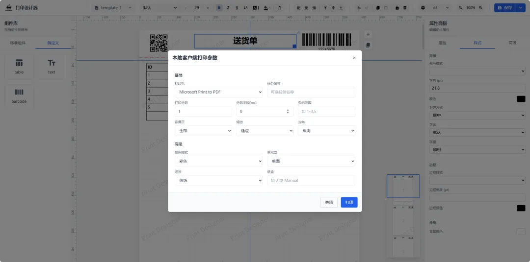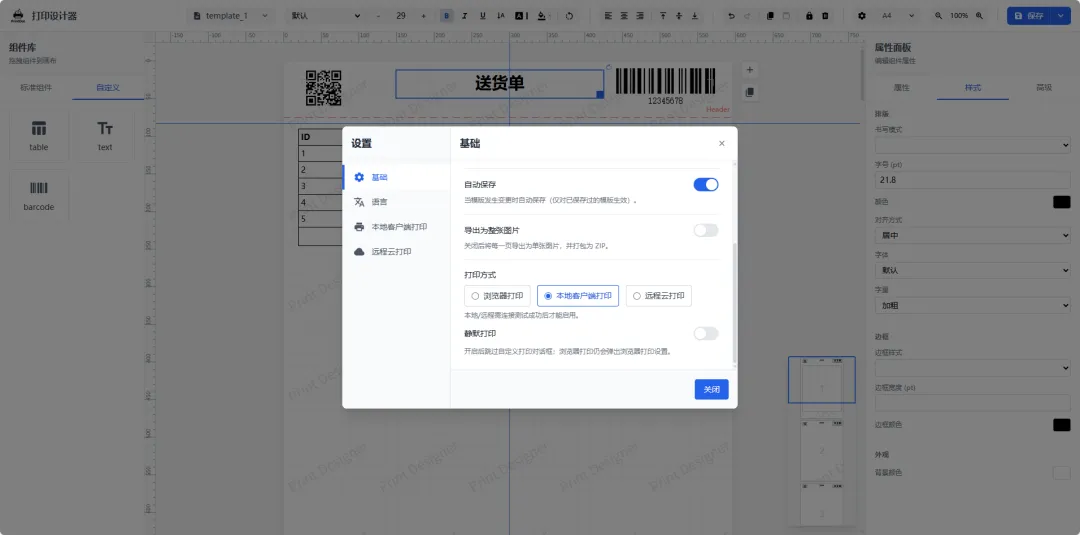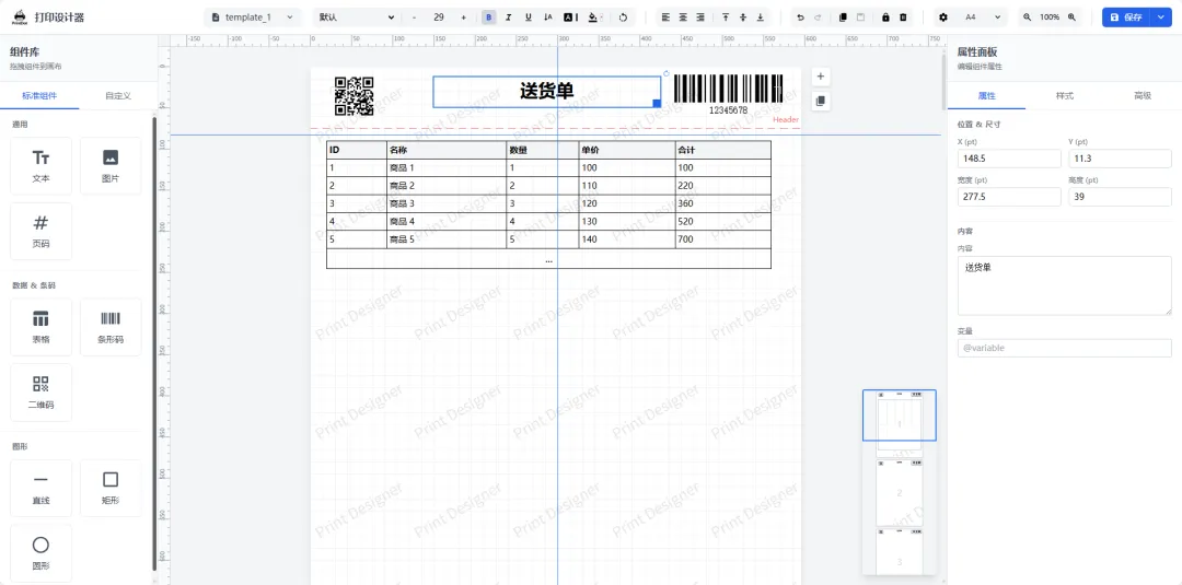 可视化设计:全功能拖拽设计器,支持文本/图片/表格/条码/二维码/形状等组件,内置标尺、网格与辅助对齐。