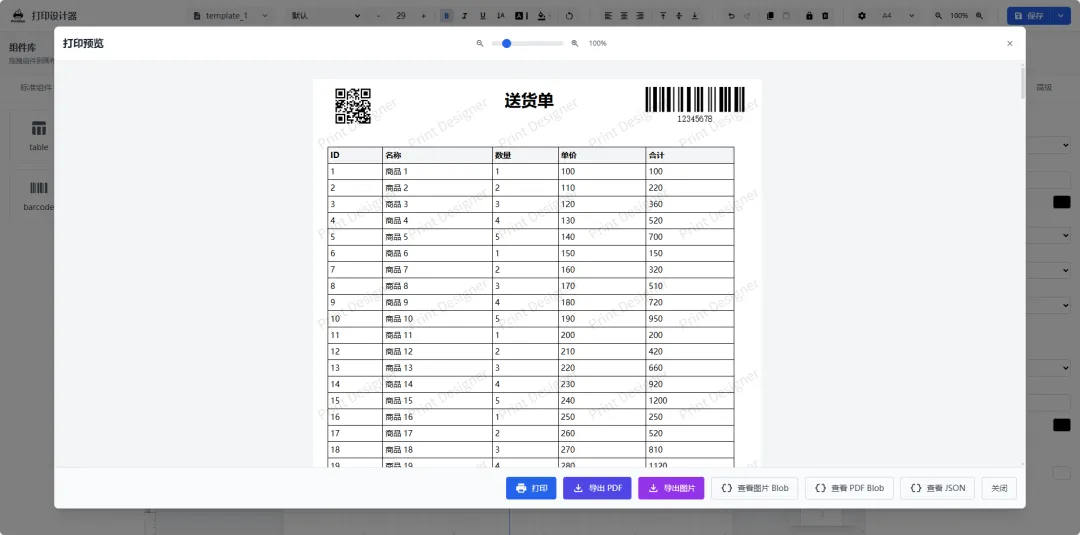 浏览器打印:原生预览与打印。