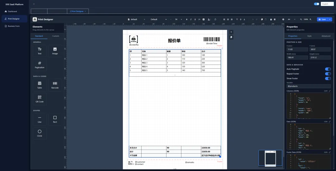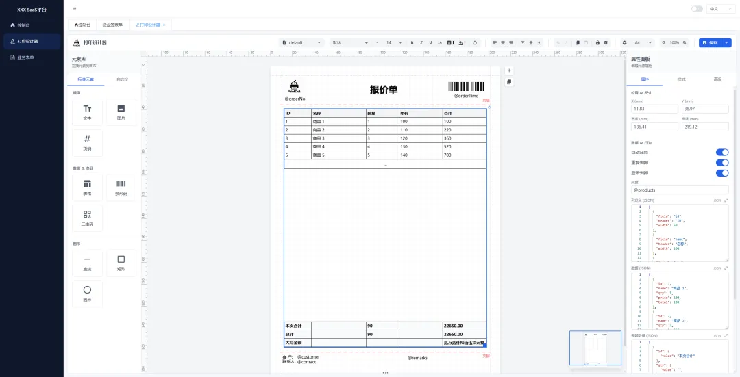 智能分页:自动处理长表格分页,支持表头/表尾重复,无需手写复杂逻辑,所见即所得。