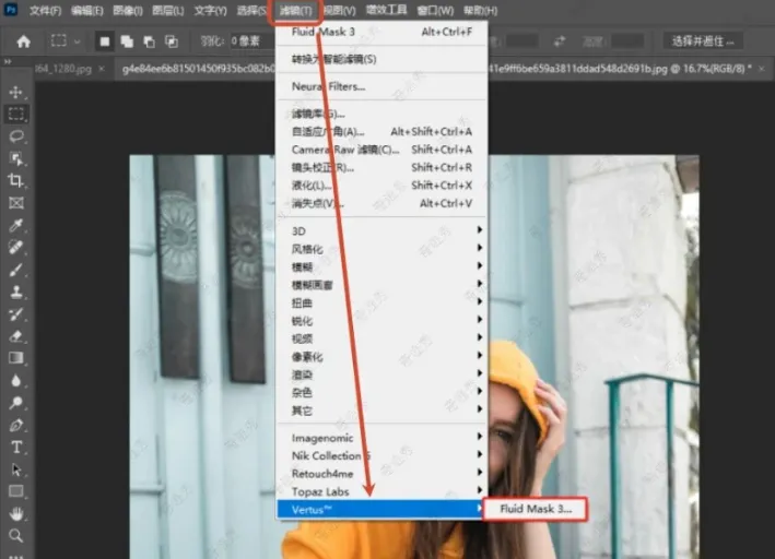 1、在 Photoshop 中打开图片,通过「滤镜 – Vertus – Fluid Mask」启动插件界面;