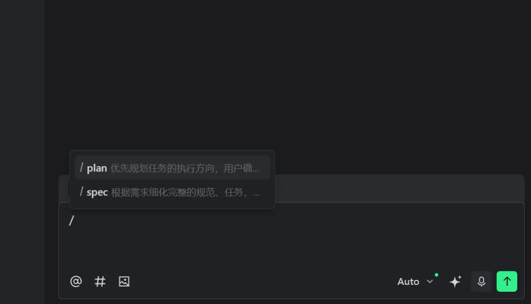 /agent 开启Agent模式 /improve 优化选中代码 /explain 解释代码逻辑 /test 生成测试用例
