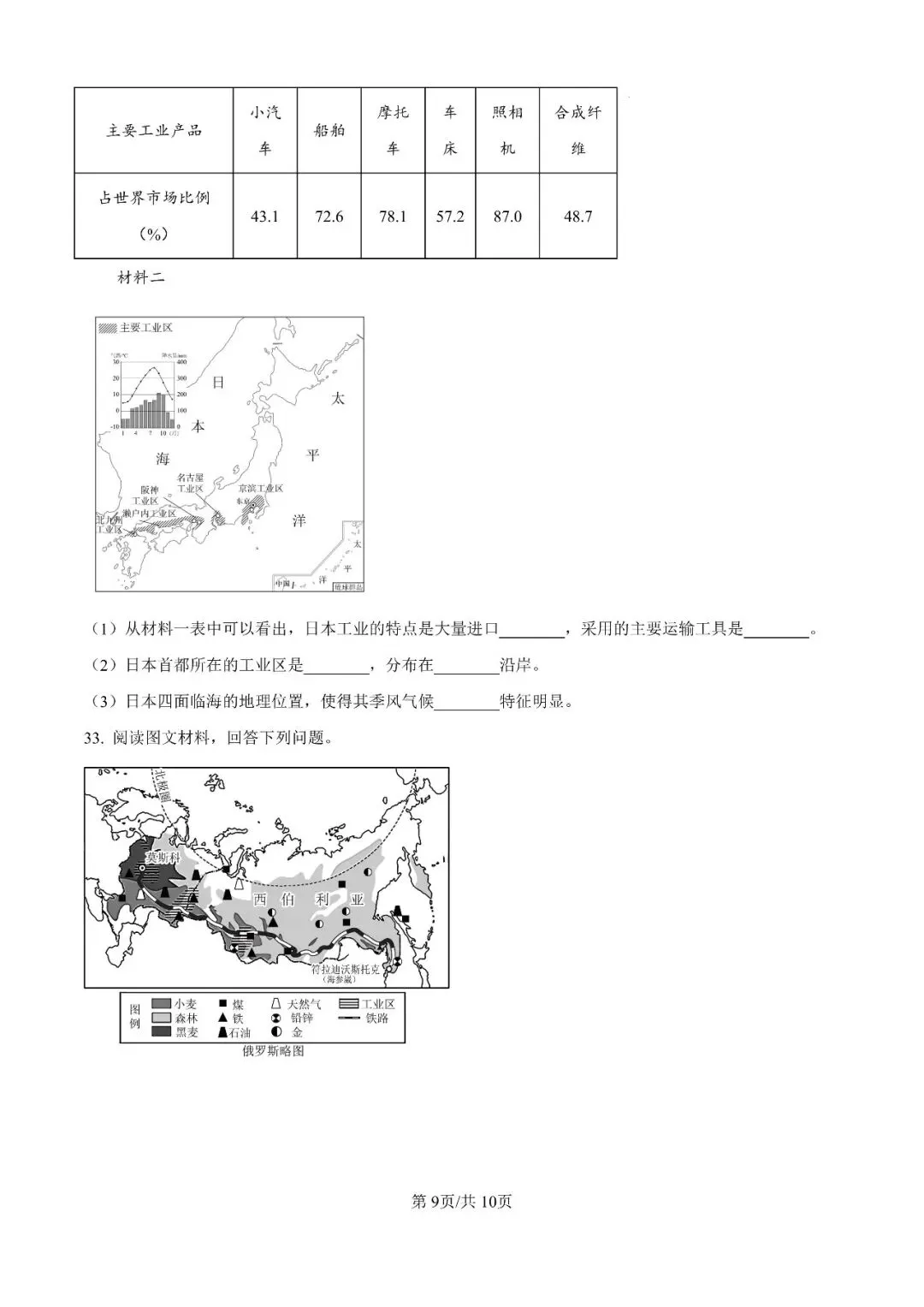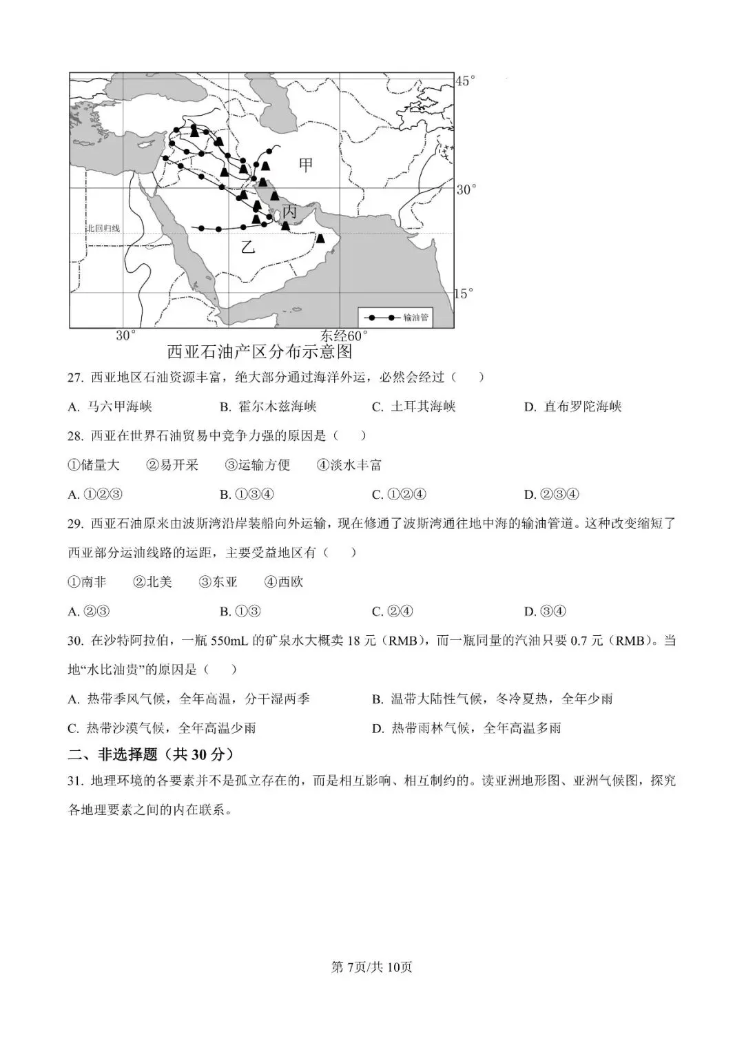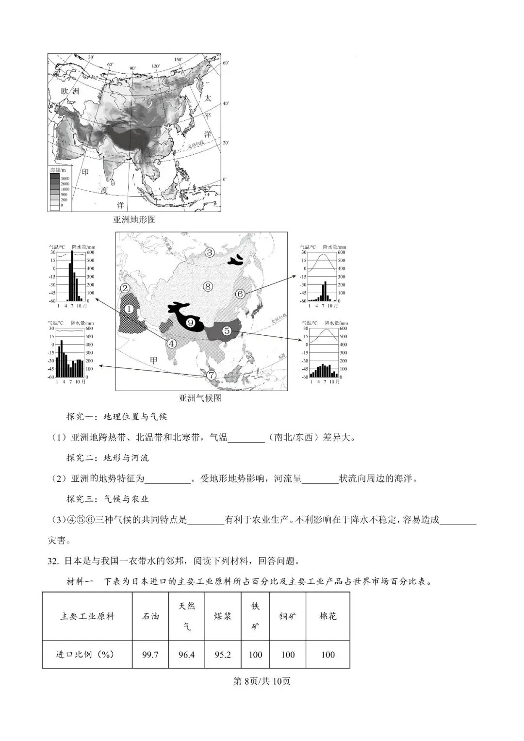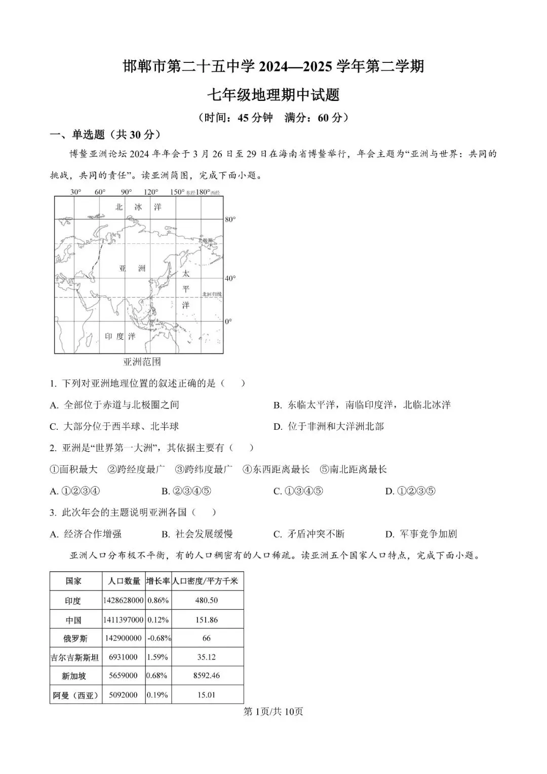 邯郸市第25中学七下期中【地理】卷-可打印(有答案)