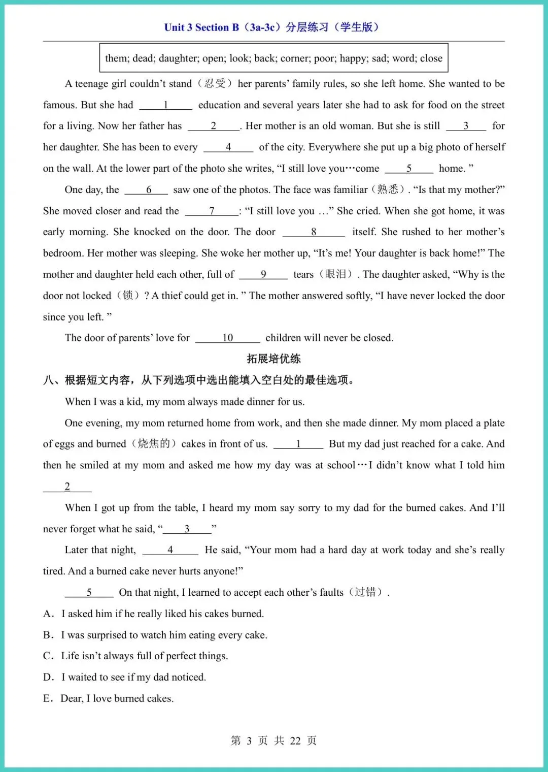 2025春人教版八年级下册英语Unit3 Section B(3a-3c)分层练习,22页精编电子版,一键可打印!这份资料把“基础巩固—能力提升—拓展拔高”三级梯度一次打包:词汇变形、句型转换、阅读策略、写作模板全配典型例题,左栏讲技巧,右栏即练即评,孩子10分钟就能摸清短板,20分钟就能看见提分。期末想冲刺110,先把这22页啃透!需要的家长现在就去打印,今晚就让孩子练起来!