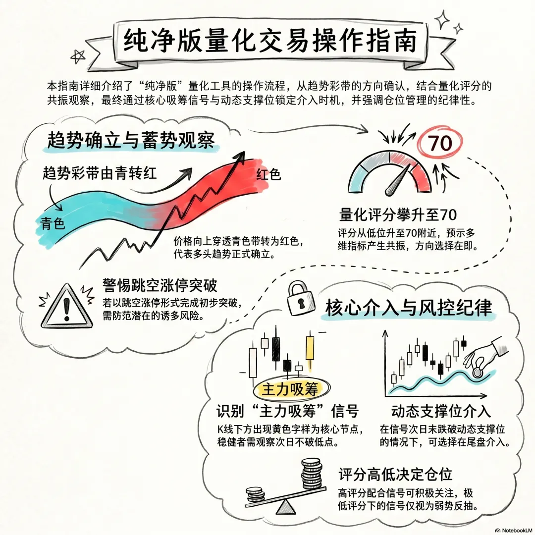 纪律提醒: 任何量化工具均需结合大环境。若右下角量化评分极低但出现信号,属于弱势反抽,需控制仓位;若评分极高且出现信号,可积极关注。