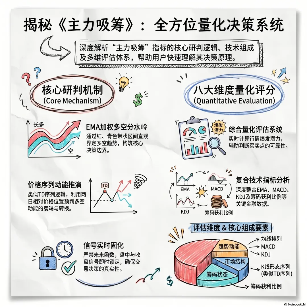 《主力吸筹》 是一款基于价格趋势带状区间与K线形态序列(类似TD序列)复合研判的决策系统。其核心逻辑通过 EMA 均线的加权算法构建多空分水岭(红青色带状区),利用价格连续两日的相对高低位置,严格推演多空动能的衰竭与转换。同时,该指标右下角引入了量化评分系统,综合了均线排列、MACD、KDJ及筹码获利比例等八大维度,辅助判定行情的爆发潜力。本系统不包含任何未来函数,信号基于盘中与收盘状态实时固化。