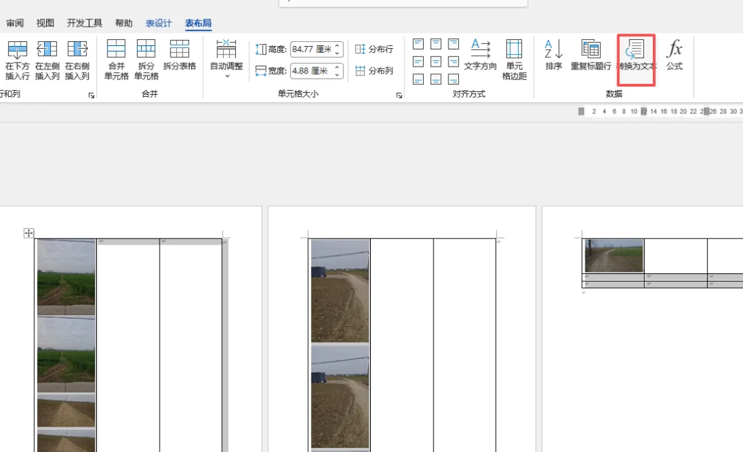 再次选中表格,在表格布局里,点转换为文本,选择制表符为分隔符,确定,图片就整齐排版好了。