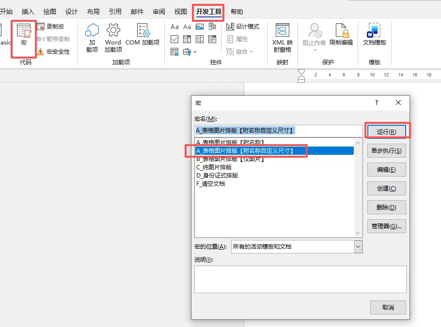 在开发工具中调整宏程序,选中这个自定义尺寸的程序,点运行