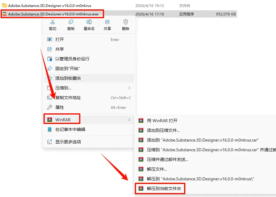 1.进入下载链接下载“Adobe.Substance.3D.Designer.v16.0.0-m0nkrus”安装包,选中下载的压缩包,然后鼠标右键选择“解压到当前文件夹”(没有解压选项点这里)