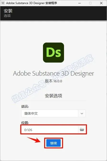 3.选择软件安装路径,建议和教程中的保持一致,本例安装在D盘(安装路径不要出现中文),点击“继续”