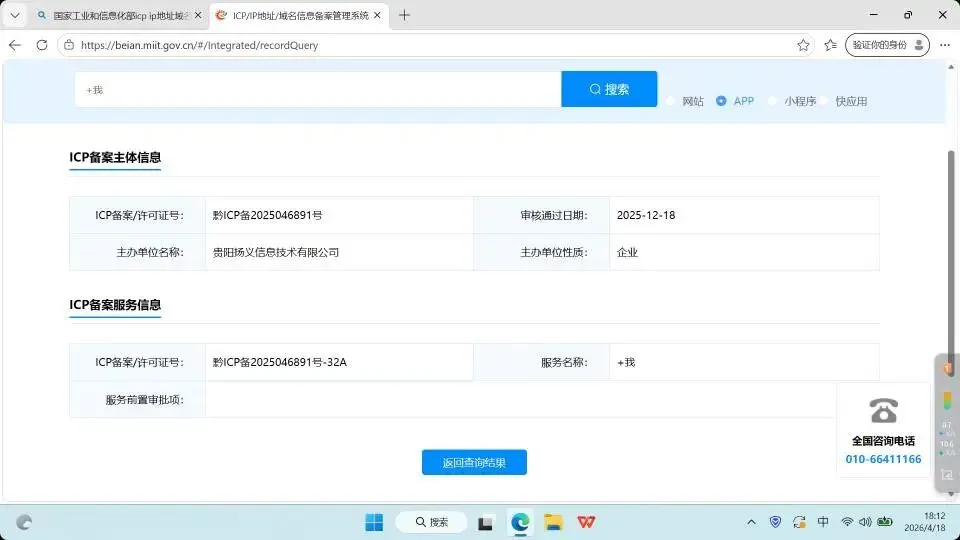 已取得工信部ICP备案 - “+我”商标