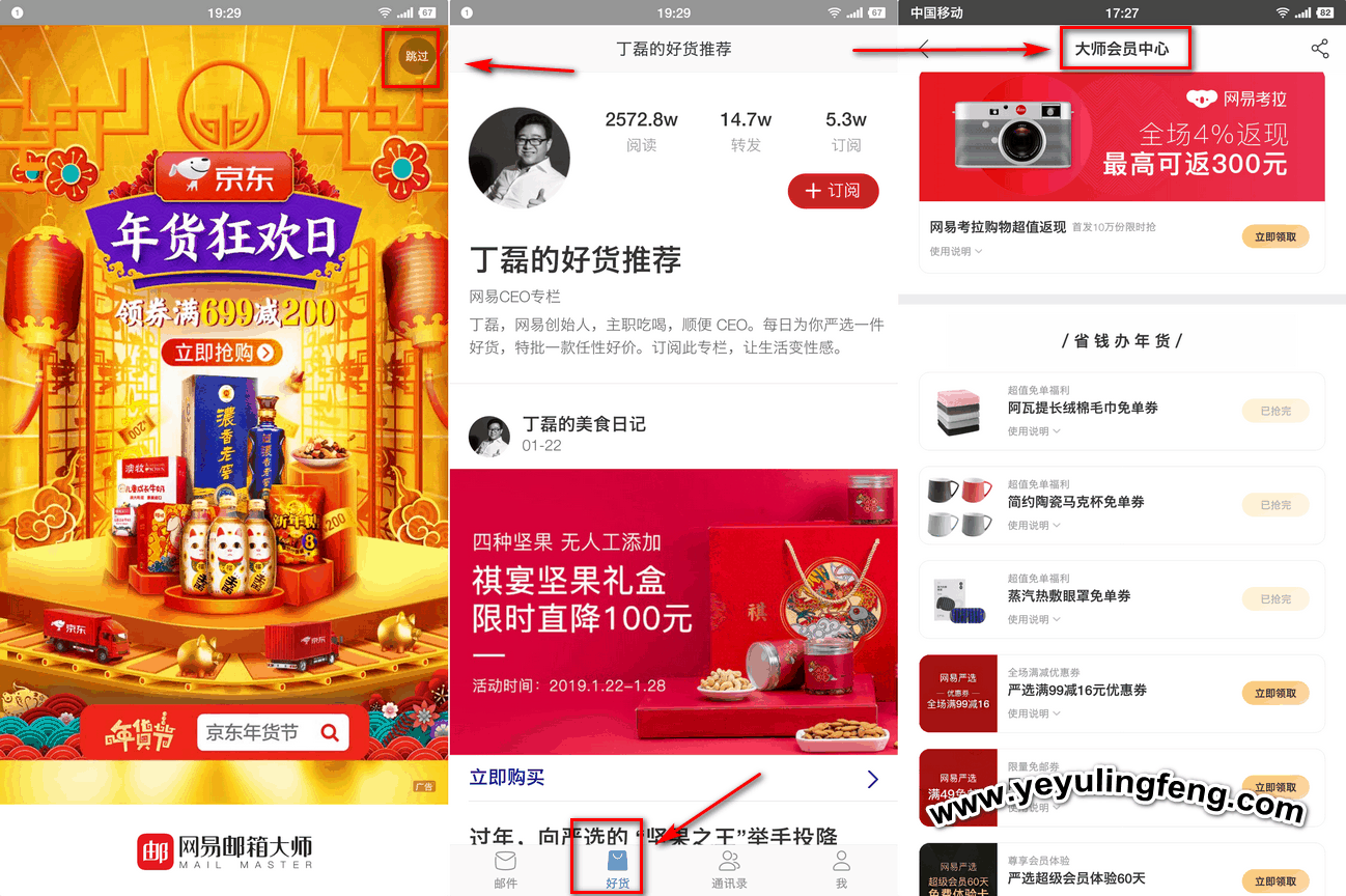 国际本不可避免也是有部分广告的,首先老夜之前使用启动页广告没有跳过按钮,邮件列表有广告插入、底部导航栏有商品版块,个人版块也有广告出没。从Google play应用商店下载的安装包6.11.2版本启动页有广告跳过按钮,到6.12.2则改为概率性启动页弹出广告了,邮件列表中没有广告插入,至于底部导航栏的商品版块还是非常顽强。国际版虽说还有广告但还不足以泛滥,除了启动页广告以外几乎没有直接性影响,以上仅代表老夜个人不专业不准确的瞎鸡儿评测,具体使用大家以本地效果为准!