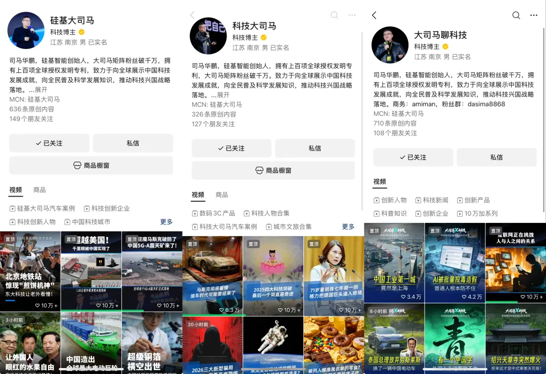 他自己就是最大胆的试验品。”硅基大司马””科技大司马”这些账号,从选题、文案、配音到视频生成,全流程AI自动化。半年涨了2200万粉丝,播放量破10亿,单条视频最高4000万播放。