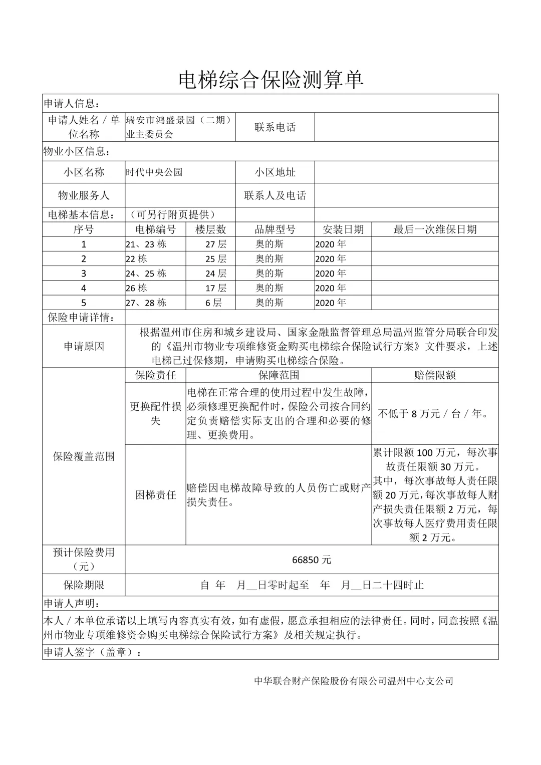 业委会已根据市政策文件,并与中华联合财产保险股份有限公司温州中心支公司对接完成保费测算,具体保费清单见附件。后续将按规定进行公示,如无异议,将正式申请使用维修资金购买电梯综合保险。