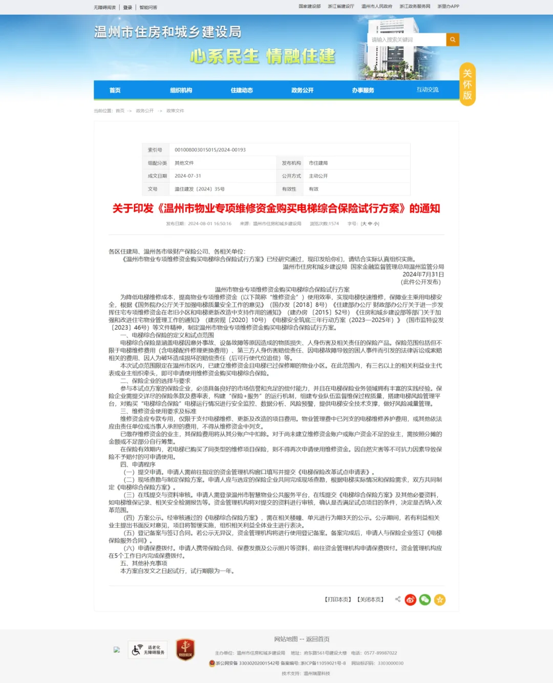 根据试点方案,购买电梯综合保险的申请流程较为便捷:经审核通过的保险方案在相关楼幢、单元公示3天,无书面反对意见或经业主代表表决通过后,即可备案拨付保费,无需每次维修均组织全体业主双三分之二表决。一次投保,长期受益,既符合政府鼓励的改革方向,又能避免因程序繁琐导致的维修延误。温州市住建局及金融监管分局联合发文推动此项试点,维修资金管理机构将在5个工作日内完成保费拨付,合规性强,落地有保障。