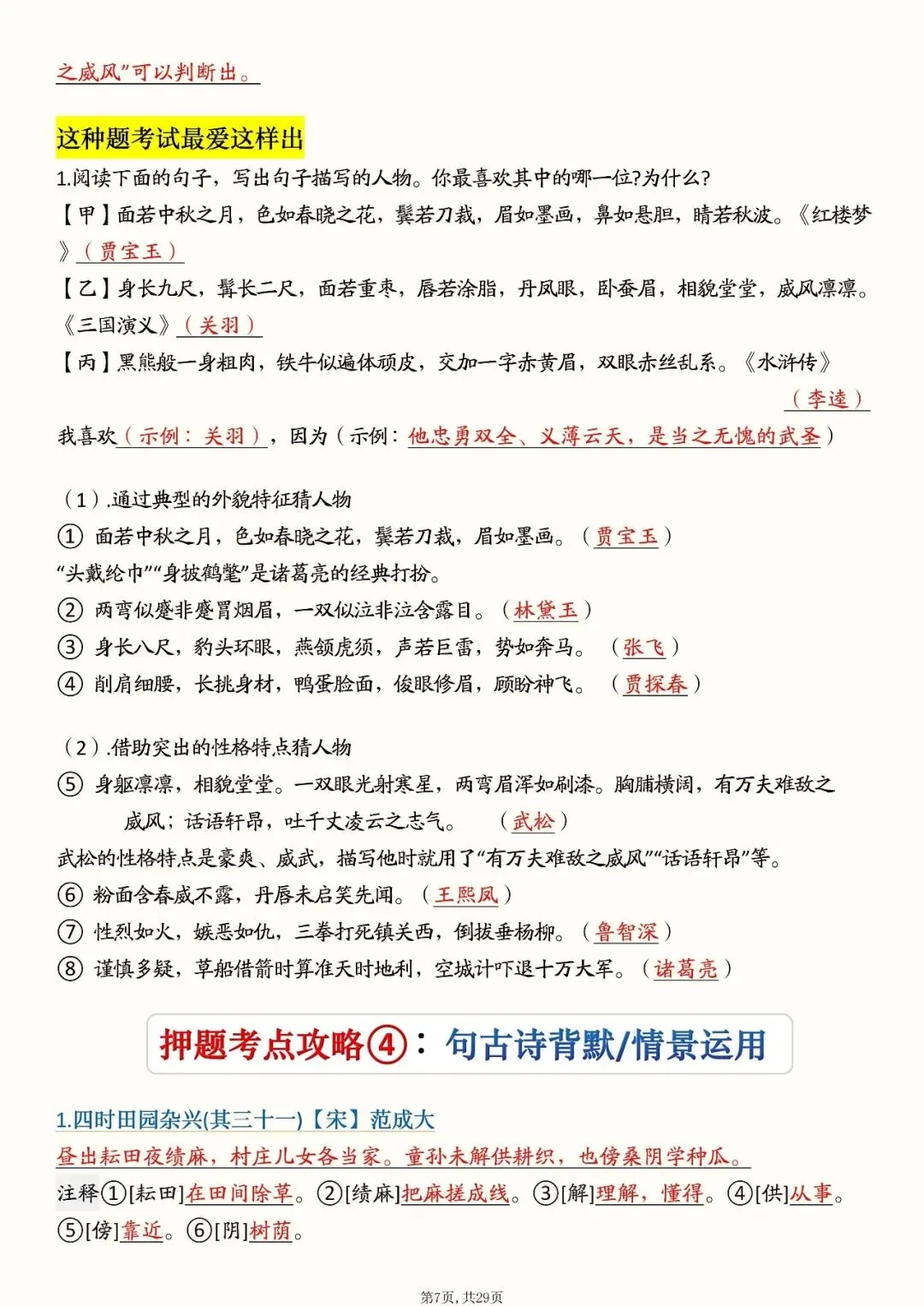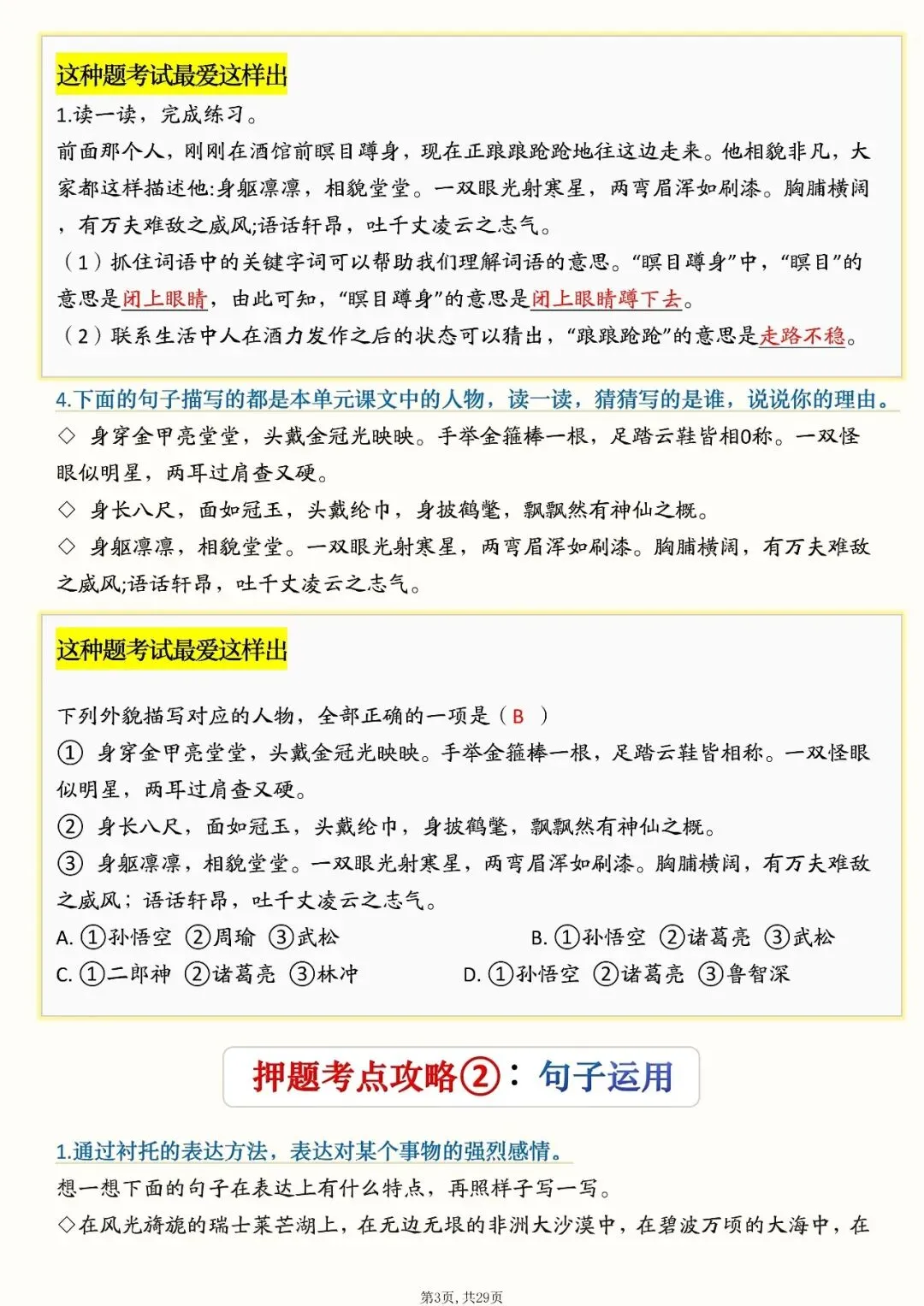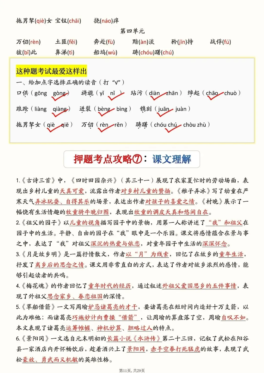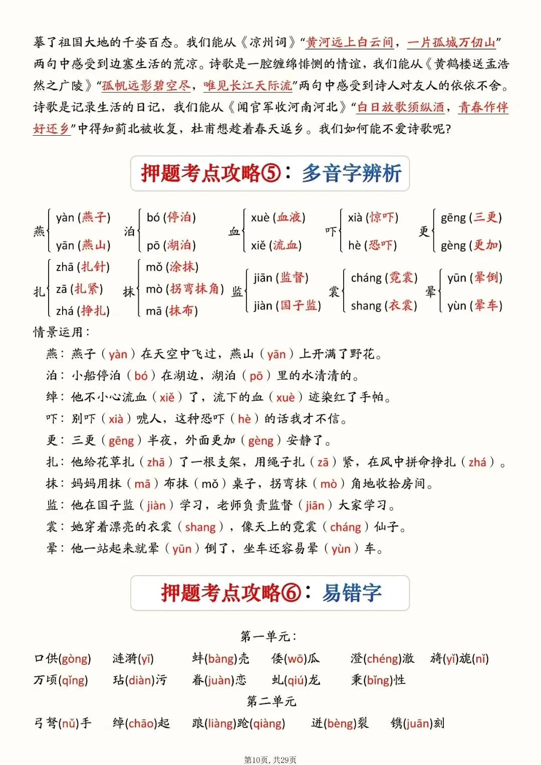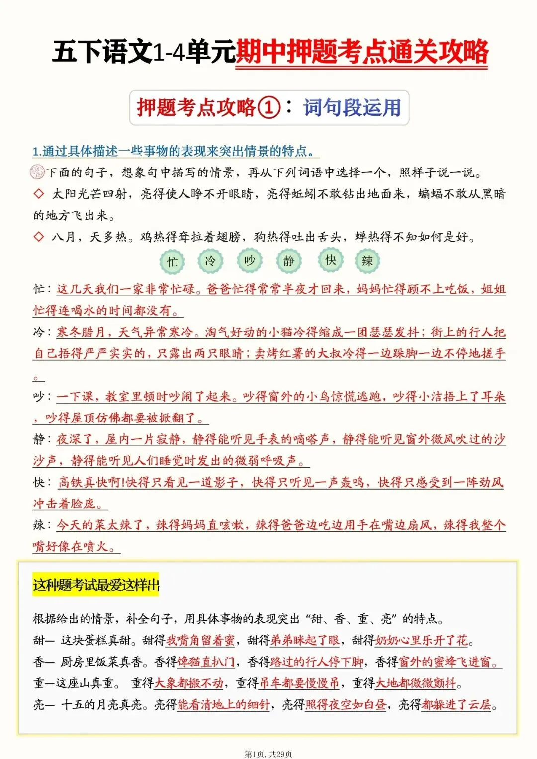 26春部编版五年级下册语文1-4单元期中押题考点提纲;词句段专项汇总;共29页;可打印