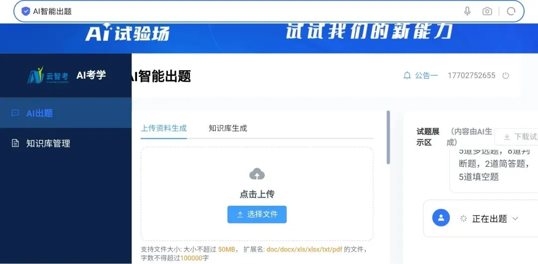 AI组卷助手前面已介绍过,今天主要说说AI命题–提供文档或者知识库智能出题,涵盖多种题型,自由组合。