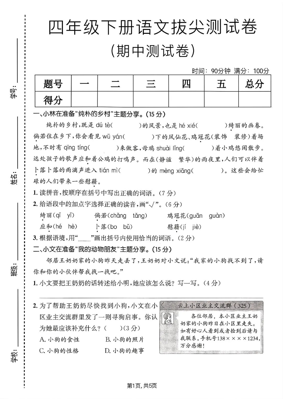 【免费下载】四年级下册语文期中拔尖测试卷可打印,PDF电子版