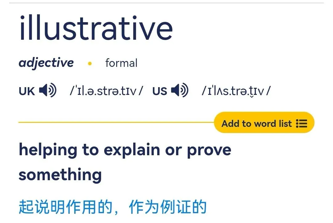 adjective.形容词:说明性的,作为例证的。帮助解释的和阐明某个观点的。常用于正式场景。