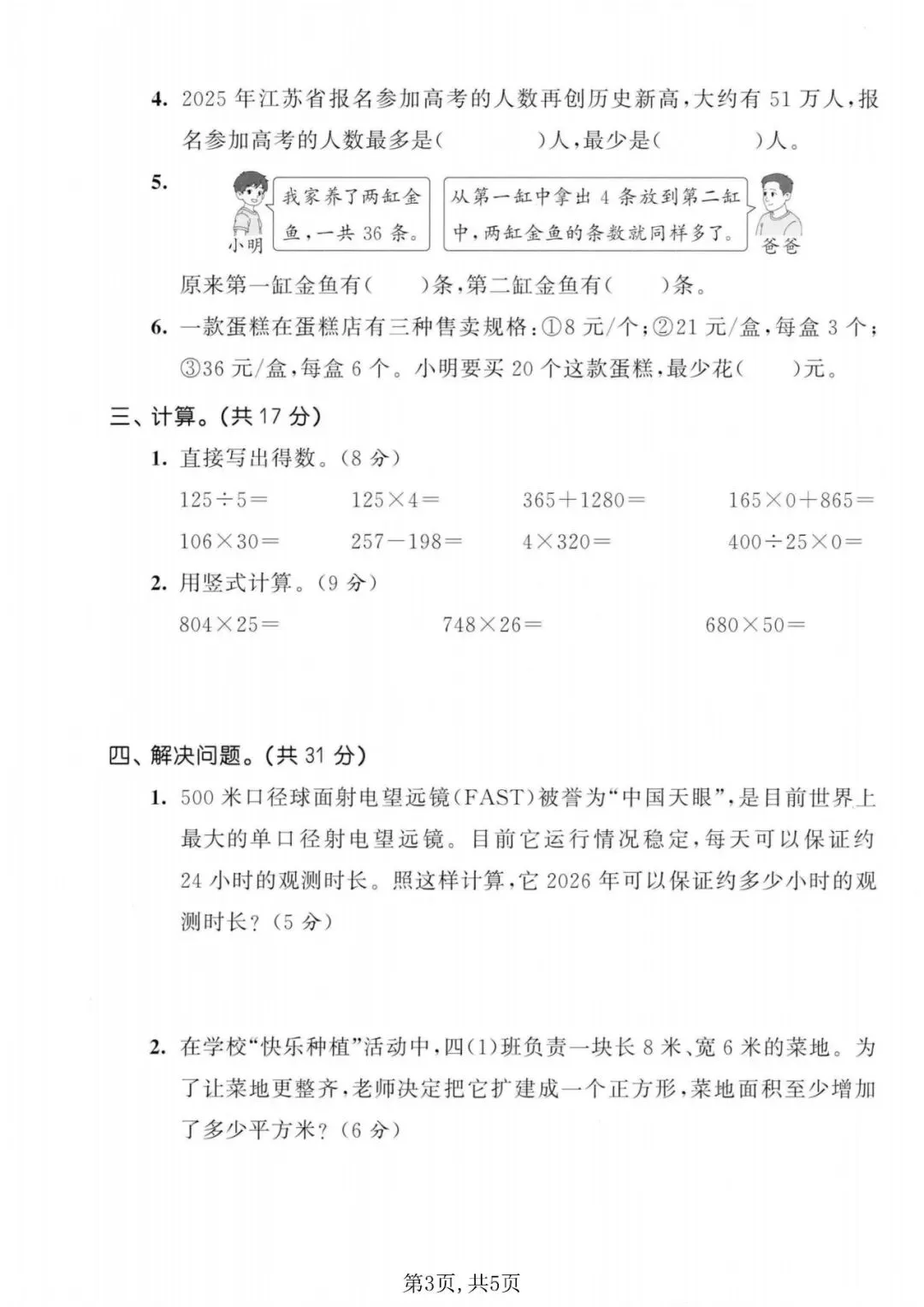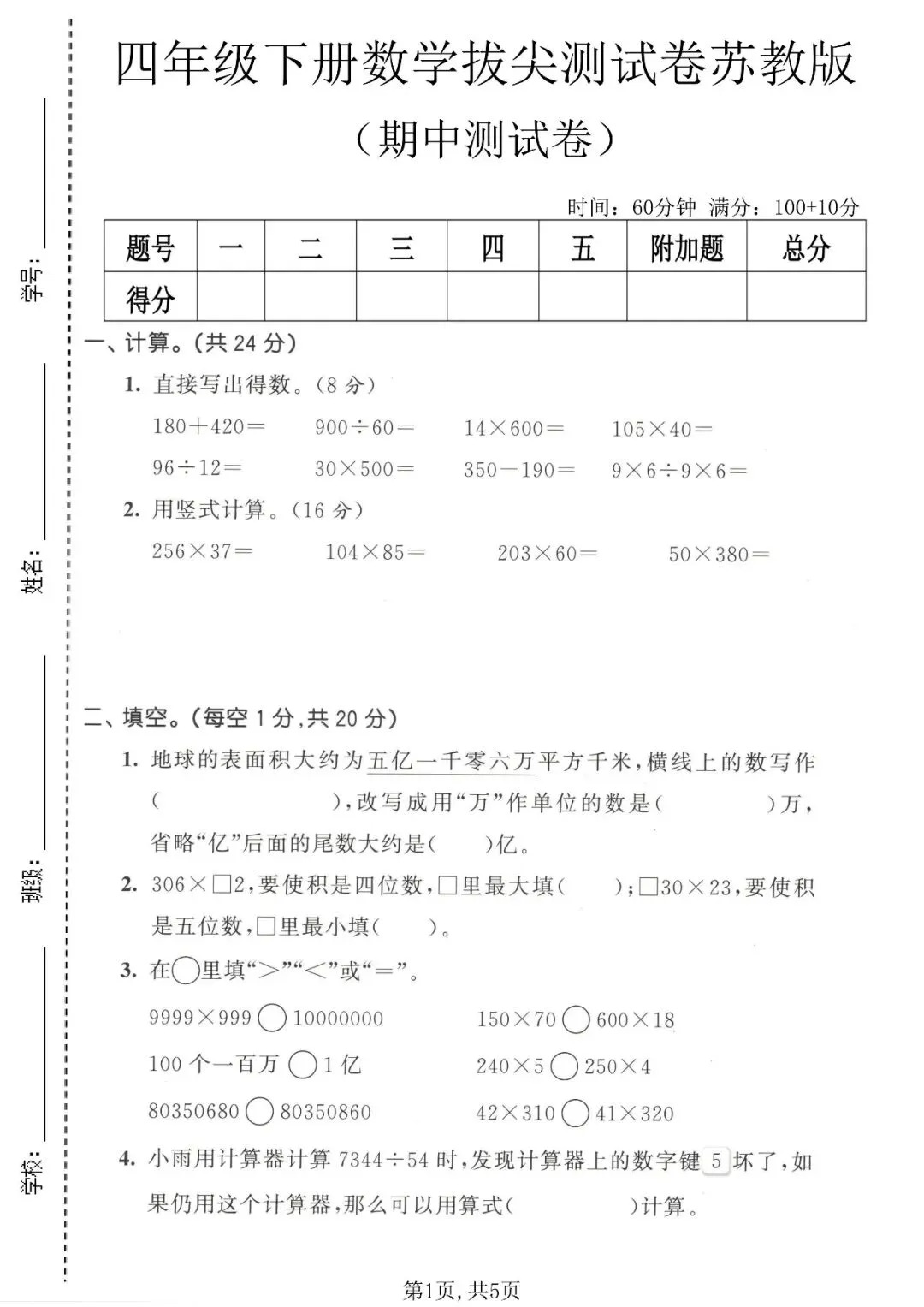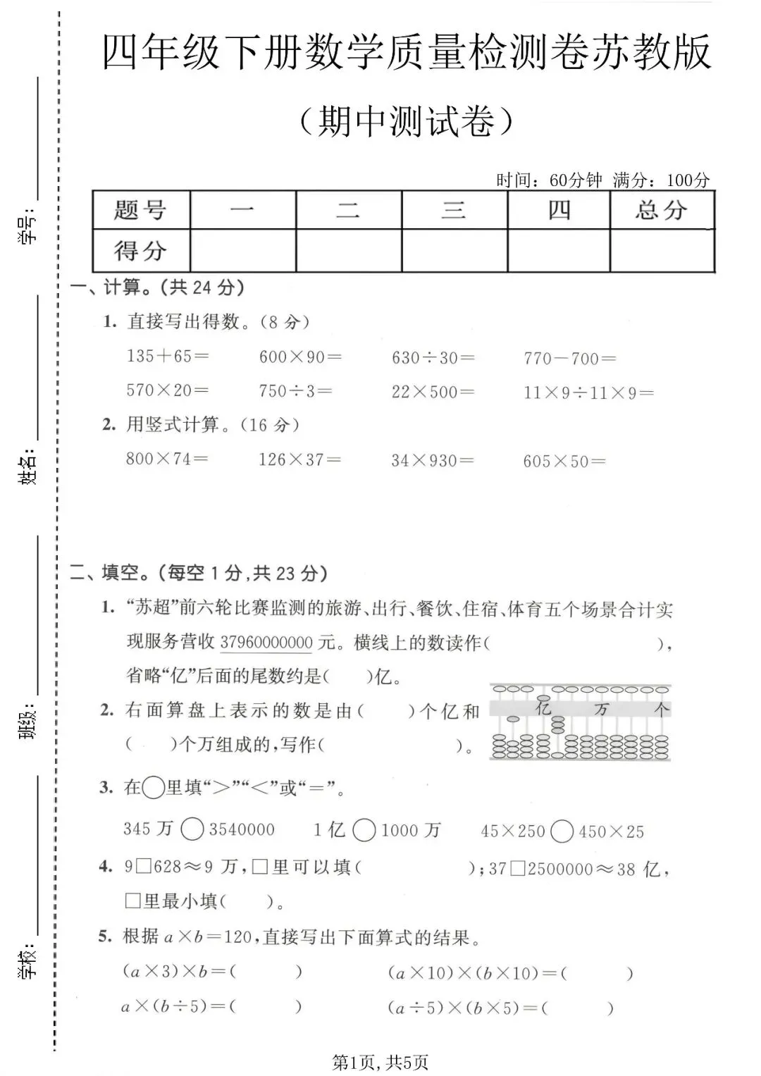 苏教版四年级数学下册《期中测试卷》3套丨可打印