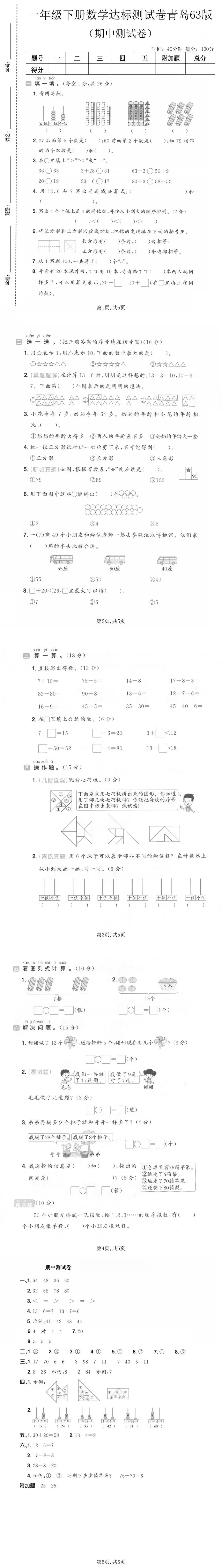 26春数学青岛63版一二三四年级下册《期中测试卷》多套 电子版可下载