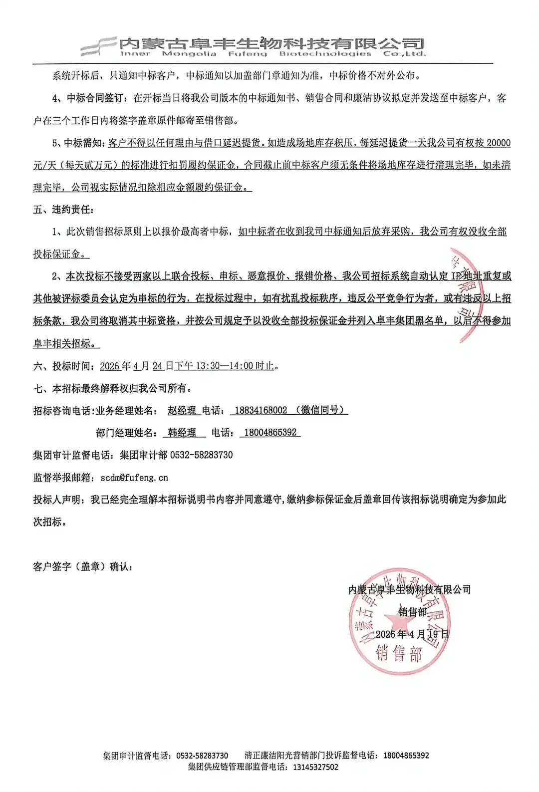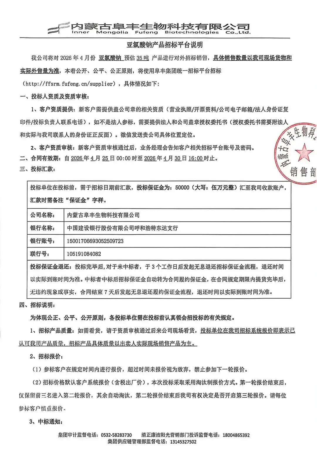 我公司将对2026年4月份 亚氯酸钠 预估35吨产品进行对外招标销售,具体销售数量以我司现场货物和实际外售量为准,本着公开、公平、公正原则,将使用阜丰集团统一招标平台招标(http://ffsrm.fufeng.cn/supplier),具体情况如下: