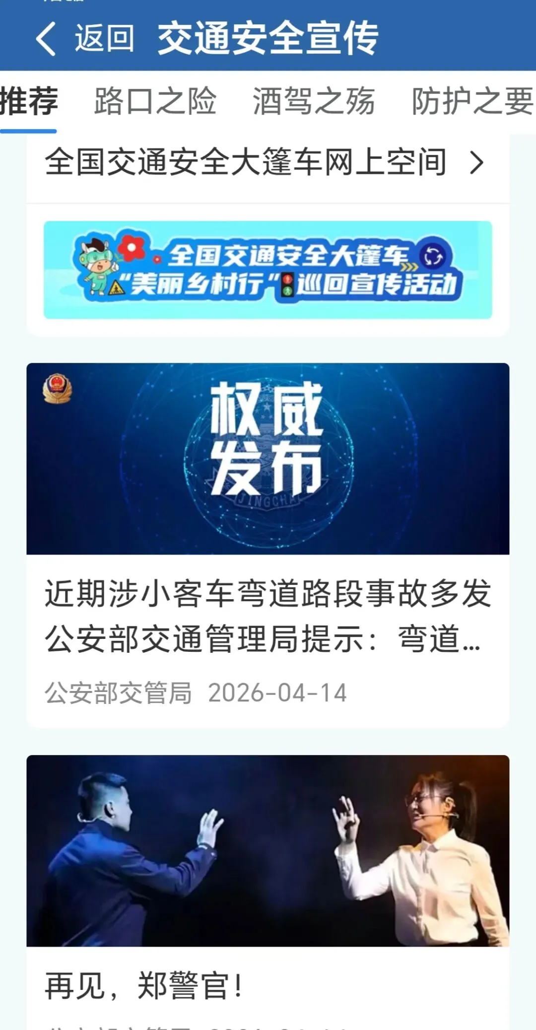 最近,公安部交管局“交管12123”APP《交通安全宣传》版块进一步扩容,在原有四个内容栏目(新驾驶人、自驾出行、亲子课堂、银龄课堂)的基础上,新增设了“路口之险”“酒驾之殇”“防护之要”三个栏目,用以更加精准的推动线上交通安全宣传教育。