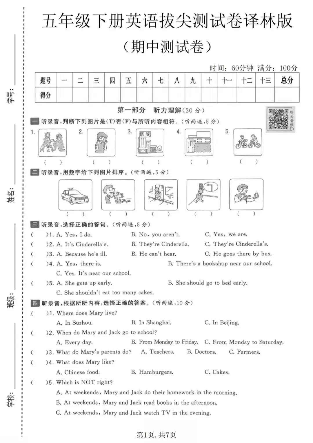 26春译林版英语五年级下册《期中测试卷(拔尖测试卷+质量检测卷+达标测试卷)》共3份,附答案高清可打印