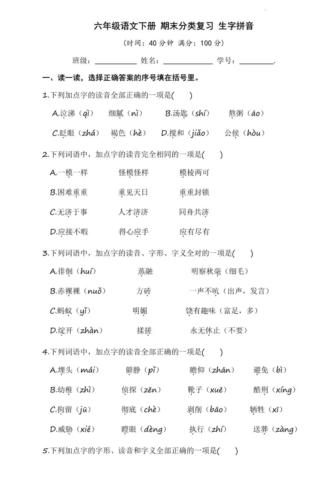 可打印电子版|【部编版】2026六年级语文下册 期末分类复习 生字拼音 含答案 本文电子版永久链接:https://pan.quark.cn/s/364ff96901a8 本文电子版永久链接:https://pan.quark.cn/s/364ff96901a8