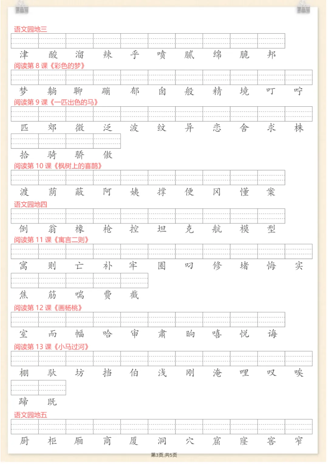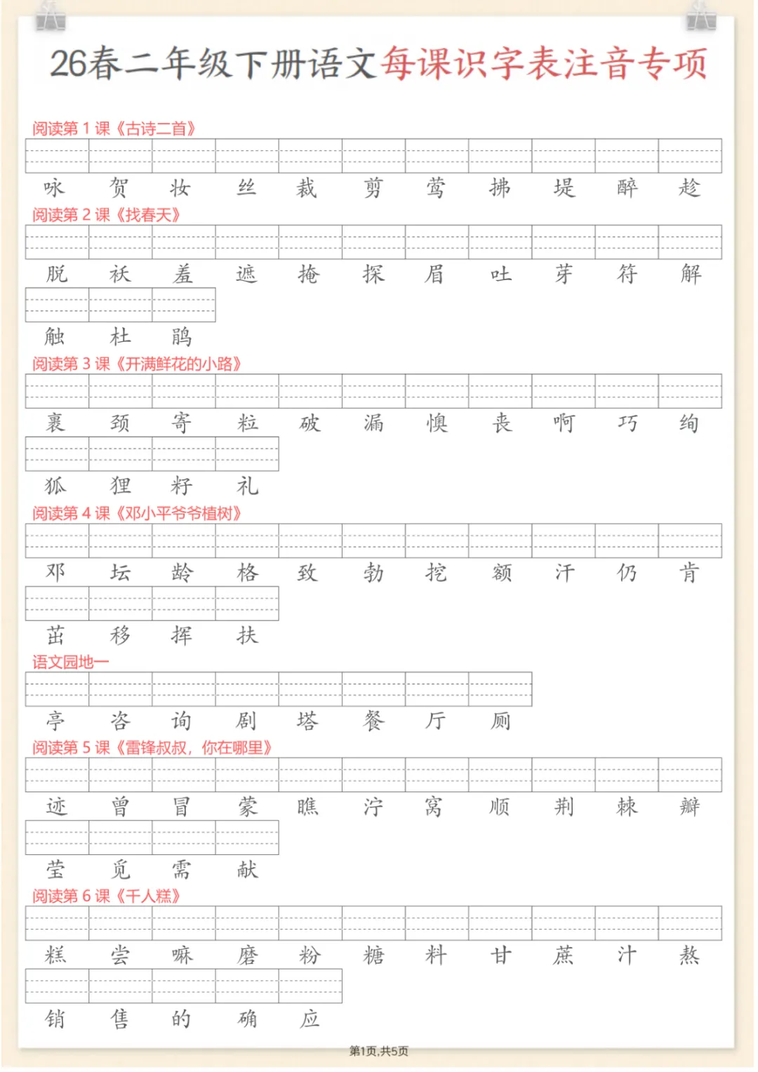 二年级下语文每课识字表注音专项练习,共11页,电子版可下载可打印,这份资料紧扣二年级下册语文识字与注音学习,围绕每课识字表开展专项训练,帮助孩子在字音认读、拼音对应和课内生字巩固等方面打好基础,也便于家长结合课本同步练习、查漏补缺,进一步提升孩子的语文基础能力。需要的家长可以抓紧下载打印出来,让孩子练一练。