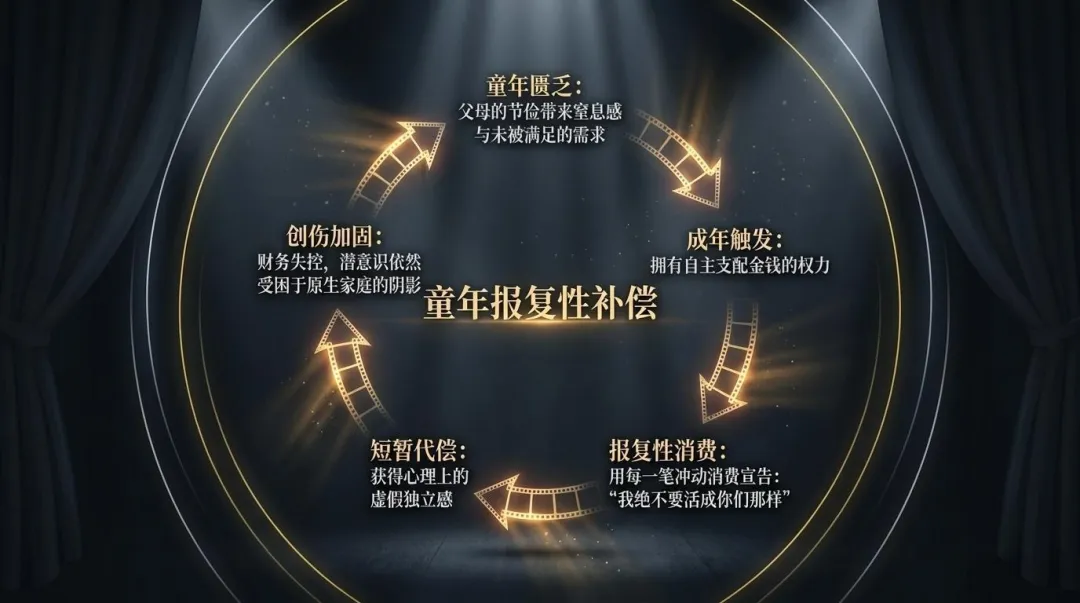 心理学管这叫「童年报复性补偿」——童年没被满足的需求,成年后以更猛烈的方式爆发。