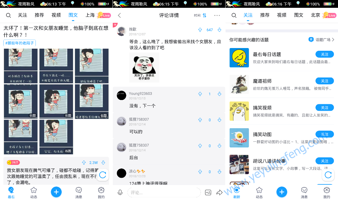 在众多搞笑段子应用中最右算是极具特色的,话题版块非常的多,用户评论除了简单的文字表情还支持动图、语音、视频回复,因此点开每一篇段子后都会有一堆令人捧腹的段子手神回复,因此有意思的不仅仅是段子,评论区更加精彩!