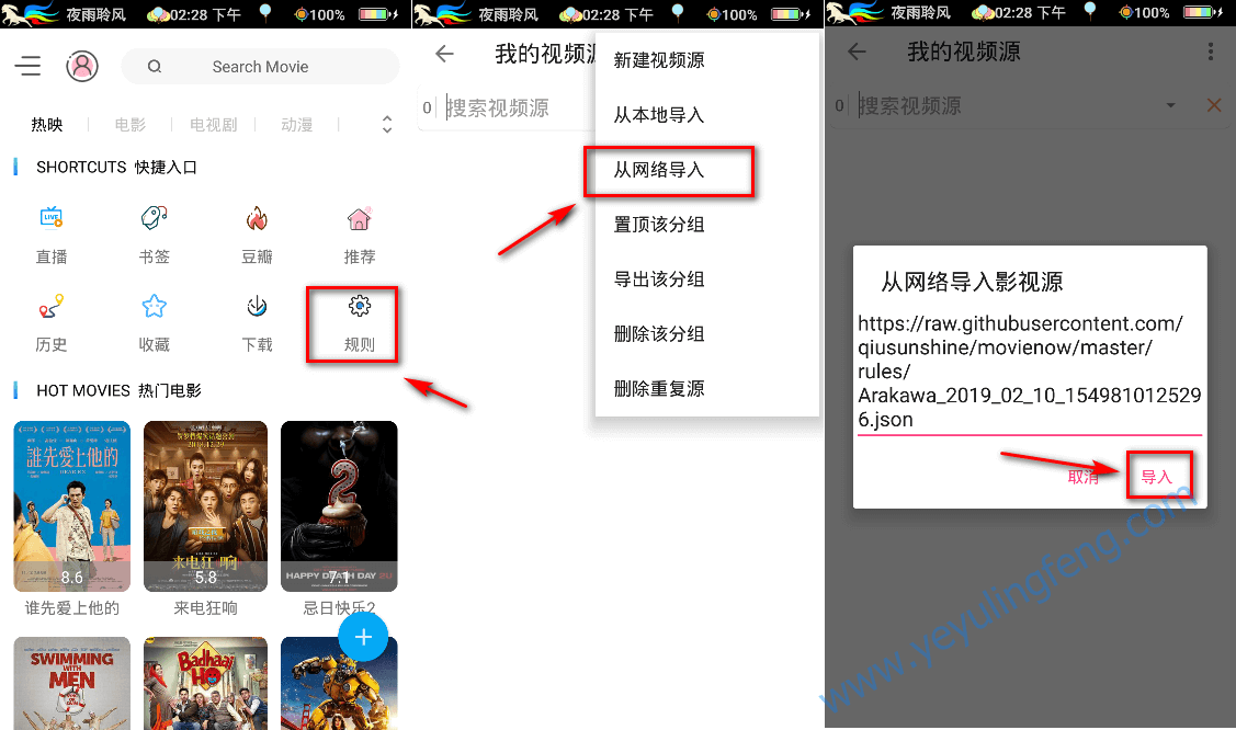 打开新方圆影视APP,首页找到“规则”版块,进入后点击右上角“从网络导入”,将刚才复制好的链接粘贴到框内导入即可,到此教程结束,是不是很简单呢!具体请参照上图箭头指示操作。