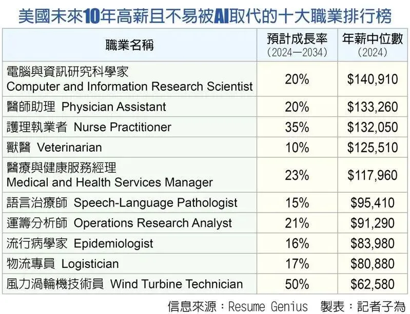 美国未来10年高薪且不易被AI取代的十大职业排行榜。 信息来源:Resume Genius,制表:记者子为