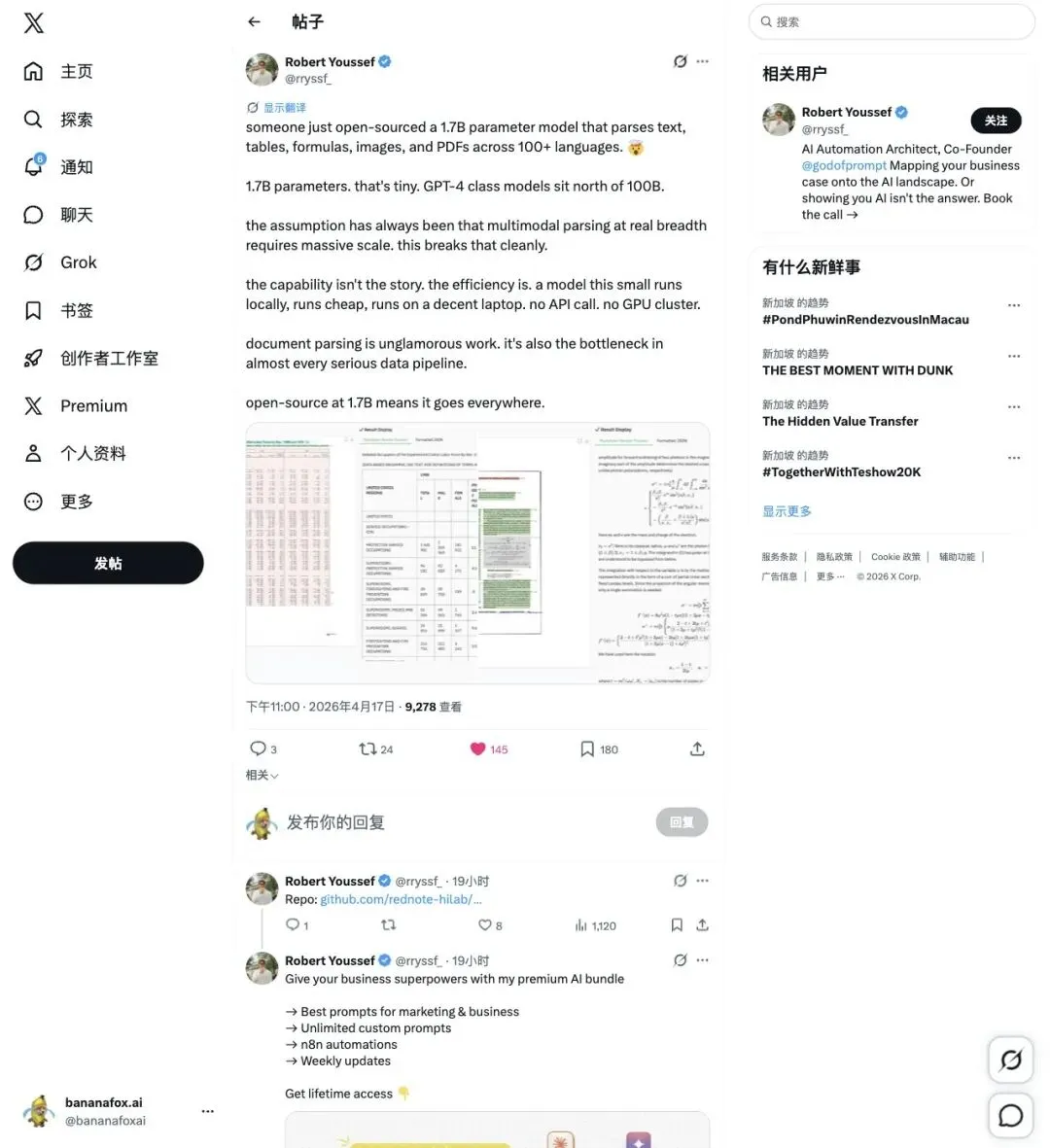 ▲ 这条推文把”1.7B OCR/文档解析模型”和 Magika 混在一起传播,约 9200+ 次浏览