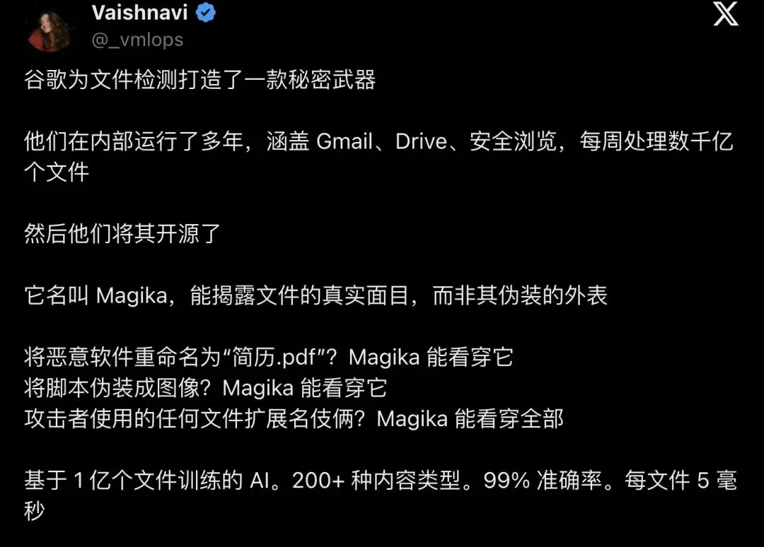 最近有条推文在疯传:「谷歌开源了 1.7B 参数小模型,能跨 100+ 语言解析文本、表格、公式、图片和 PDF。」听起来很炸,但这个描述——根本对不上 Magika。真正的 Magika,是谷歌内部用了多年、每周处理数千亿文件的 AI 文件类型识别系统,1.0 版本刚用 Rust 重写完,支持 200+ 文件类型,准确率约 99%。它不是 OCR,不是文档解析器,它做的是更底层、更关键的一件事:看穿文件在伪装什么。