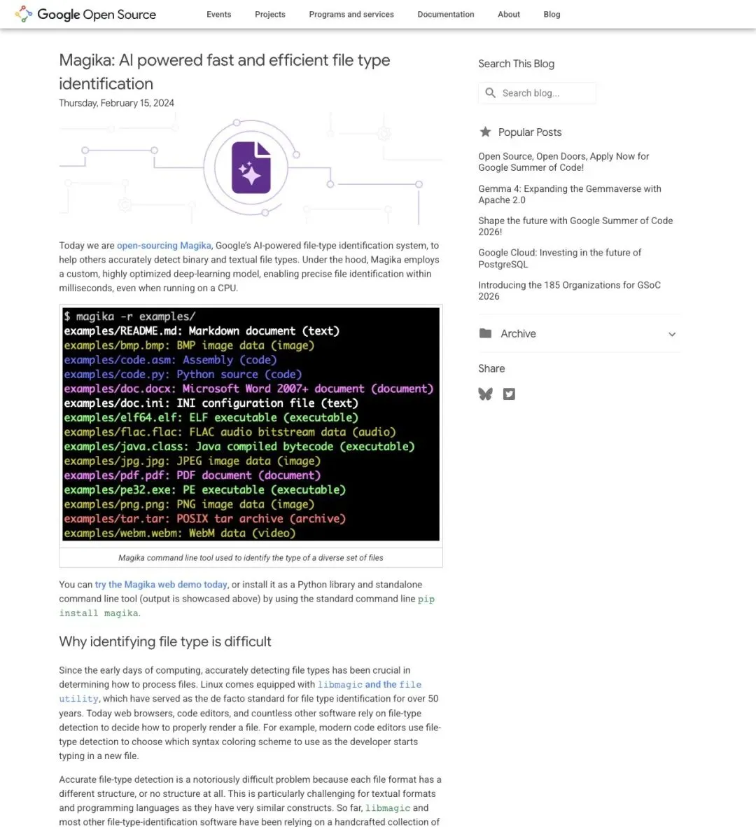 “Today we are open-sourcing Magika, Google’s AI-poweredfile-type identificationsystem.”
