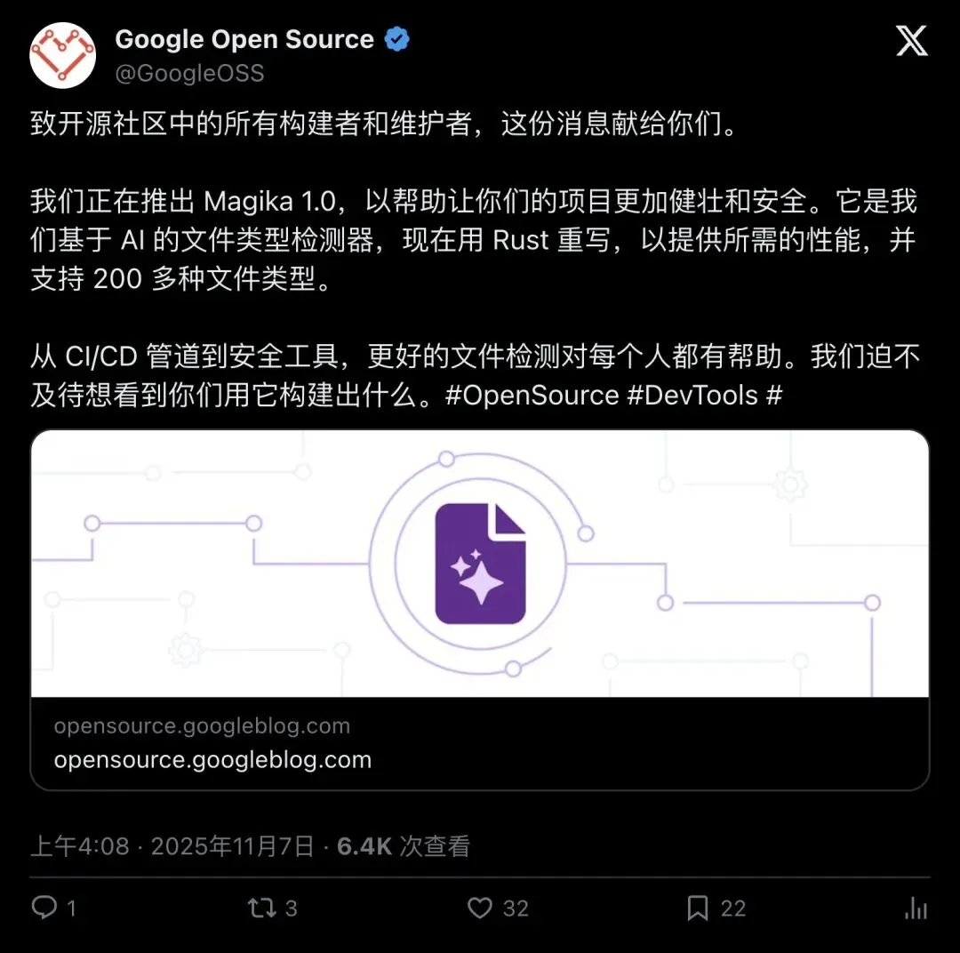▲ @GoogleOSS 发布 Magika 1.0 公告