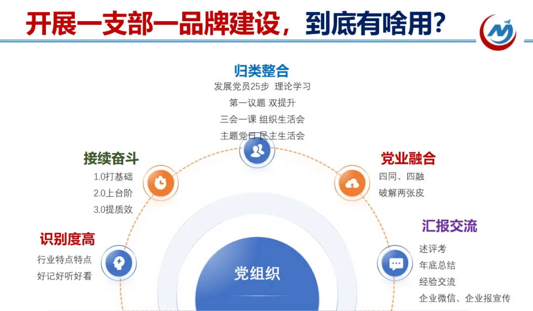 5.一支部一品牌,最终目的:让党建有力量、党员有干劲、业务有提升。