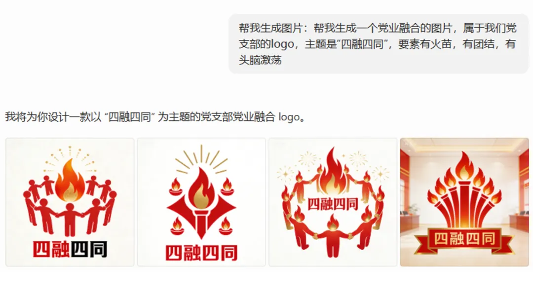 2. AI 设计师,输入:党建 LOGO,名称 XX,寓意 XX,风格简约正式,生成 4 个方案。不满意继续微调:火苗大一点、文字加粗、颜色更红。