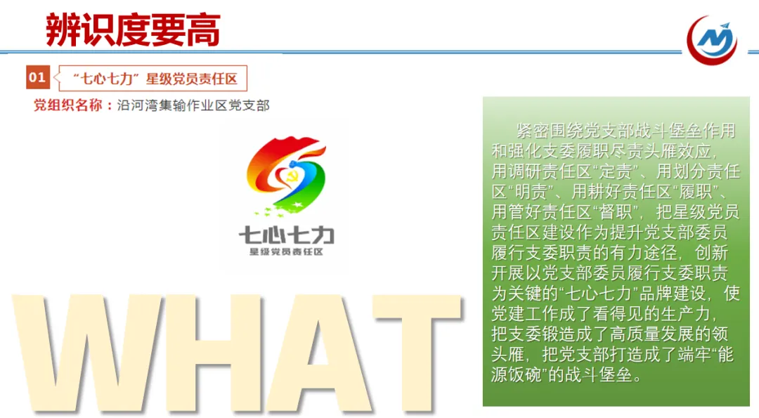 4. 对上级要求:硬任务、硬指标、硬成果,从中央到国资委,再到集团、公司,都明确要求:一支部一品牌、一支部一特色、党业融合、双融双促。品牌就是你们支部的成绩单、代表作、示范窗口。