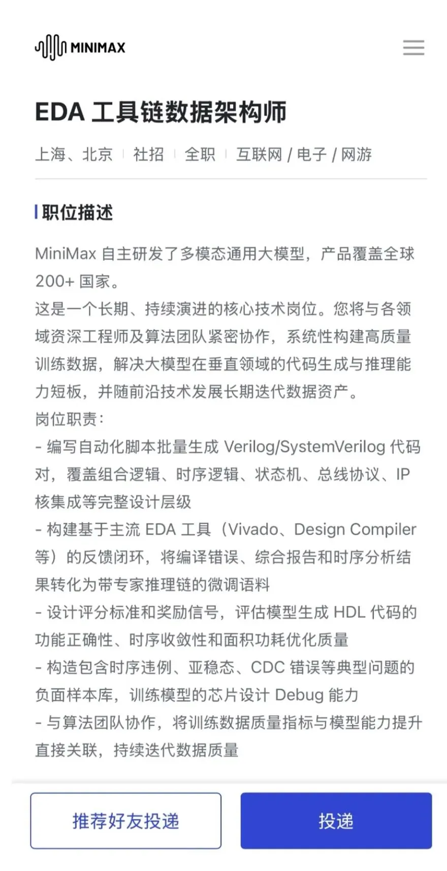 “高大上”的高科技行业并不是企业的护城河,越是利润高昂的行业,越容易被AI降维打击,被AI削起来旁观者就越没有心理负担。最近MiniMax也开始在EDA领域布局,从网上公开的招聘信息来看,已经可以窥见一二。这两年,无论是海外的Cadence和Synopsys都已经将AI融入了自身的产品中,国内的EDA公司也紧随其后。不论如何,由通用人工智能科技公司主导相关项目,也自然是值得一看的。