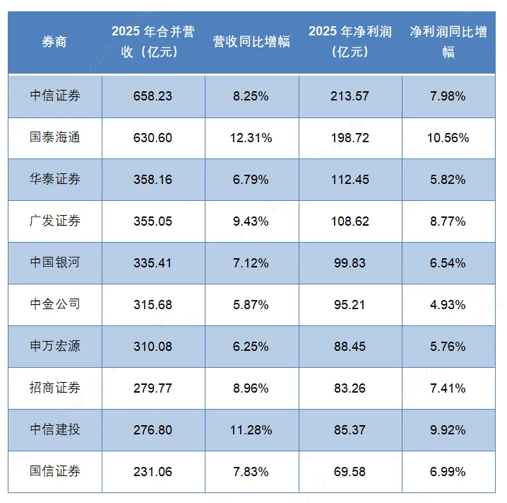 以下为十大证券公司2025年合并营收、净利润及同比增幅数据: