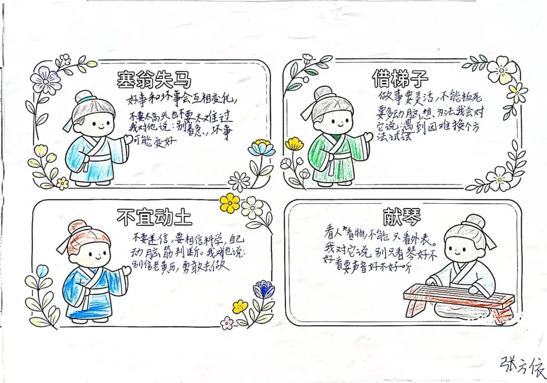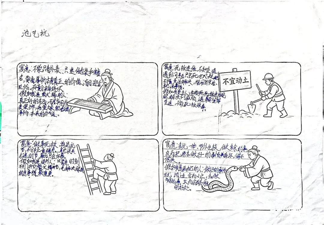 他在《不宜动土》中设置了黄历的照片十分贴合故事情节;在《塞翁失马》里画了马,《借梯子》里配上了梯子,设计得很贴切。