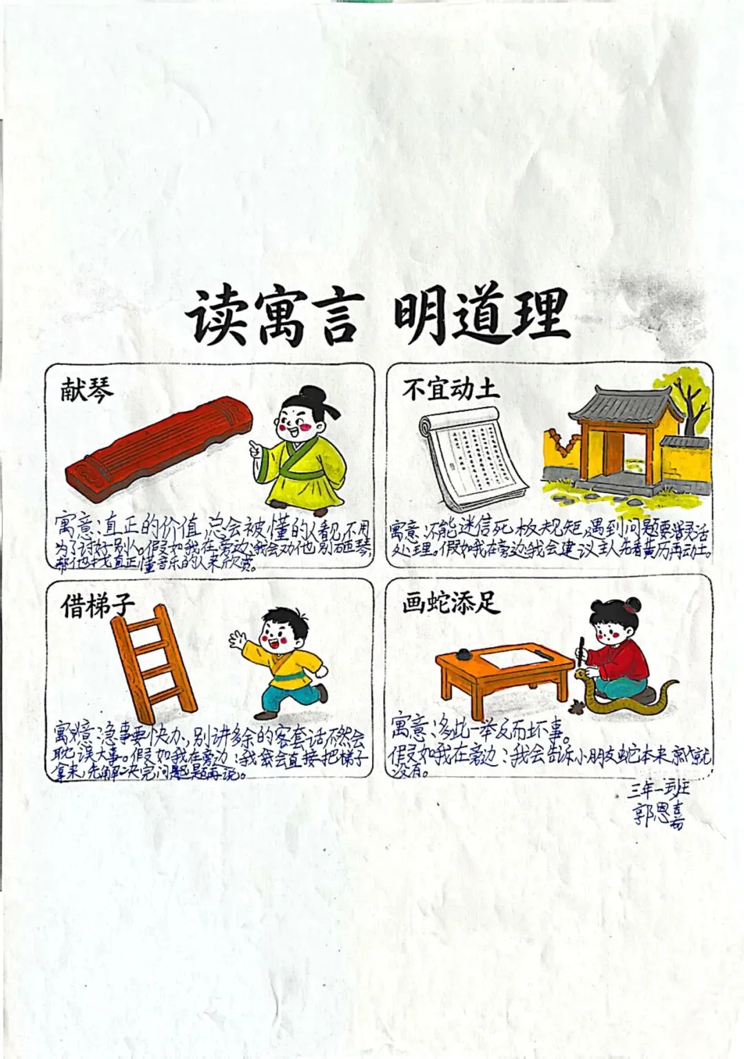 同学们也进行了评价:郭恩嘉制作的寓言小报里都标注了每个故事的小题目,还有整张小报的大题目,很好。
